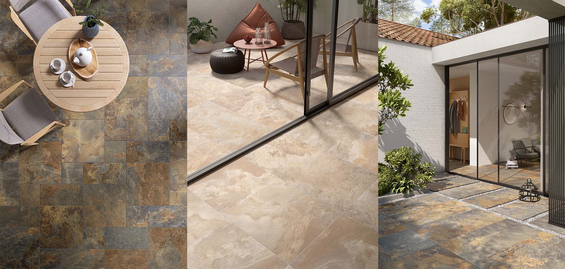 Le collezioni outdoor di Elios Ceramica sono disponibili in diversi formati e in superfici strutturate antiscivolo R11, conformi agli standard di sicurezza per ambienti esterni e piscine.