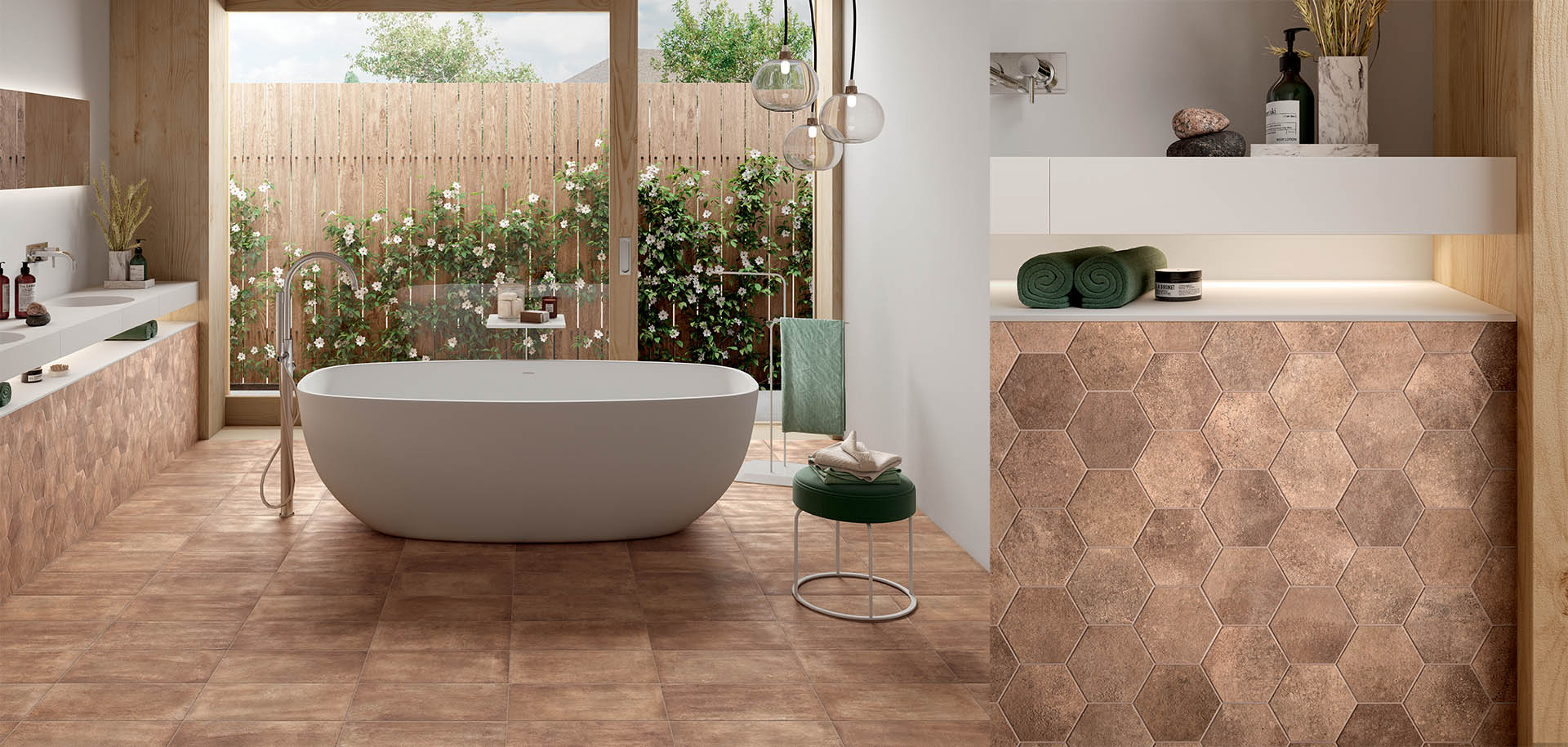 Le pavimentazioni di dimore storiche e residenze signorili della tradizione italiana rivivono in Terre Etrusche attraverso una combinazione cromatica evocativa del materiale artigianale. Formati modulari per ambienti interni ed esterni, geometrie esagonali, mosaici e decorazioni maiolicate si armonizzano per offrire innumerevoli soluzioni caratterizzate da eleganza e individualità.