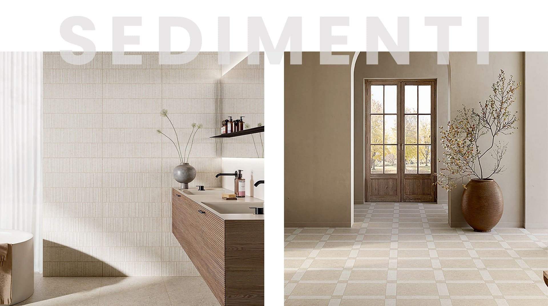 Sedimenti amplia la propria gamma con nuovi formati e con il decoro Sticks che invita a giocare con geometrie e contrasti. Le versioni Selected e Tumbled offrono due interpretazioni complementari: la prima elegante e lineare, la seconda più rustica e materica. I nuovi Brick, disponibili nelle quattro tonalità, ampliano ulteriormente le possibilità creative, trasformando Sedimenti in una collezione capace di dialogare con stili e progetti diversissimi.
